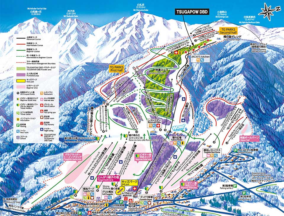 白馬エリアの中で2番目に大きなコース面積を持つスキー場が栂池高原です。白馬村に隣接する小谷村に位置します。特に初心者に優しいスキー場、ファミリースキーヤーに人気のスキー場として知られています。栂池高原は初級者向けの「初級者天国」というイメージが強いですが、実は中上級者向けのロングコースも充実しており「中級者天国」でもあります。ゲレンデトップの標高1704mは白馬エリア内でも有数の高さであり、スキー場上部の上質なパウダースノーは「TSUGA-POW」とも呼ばれています。近年安全講習(無料)の受講をを前提としたツリーランエリアである「TSUGAPOW DBD」もオープンし、ますますその魅力を増しています。